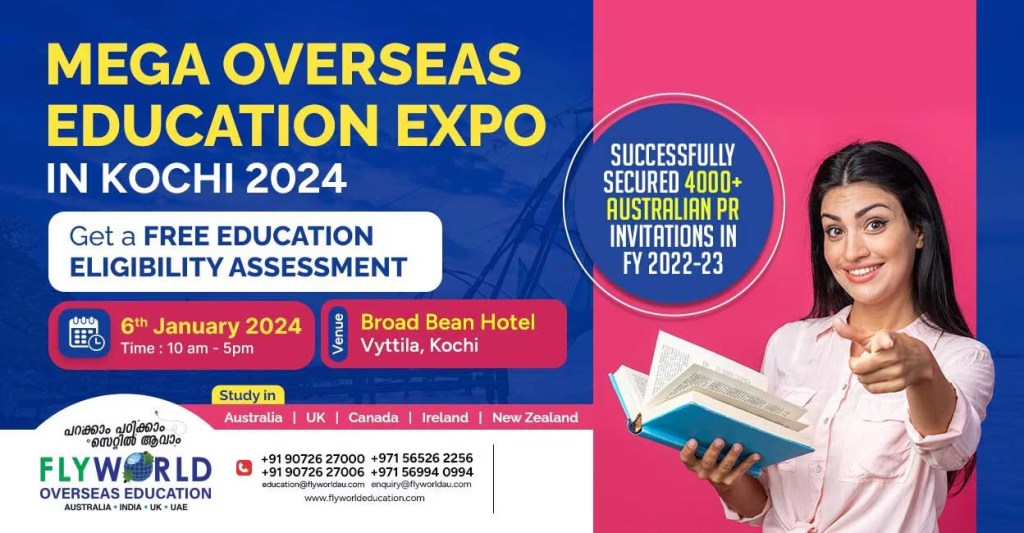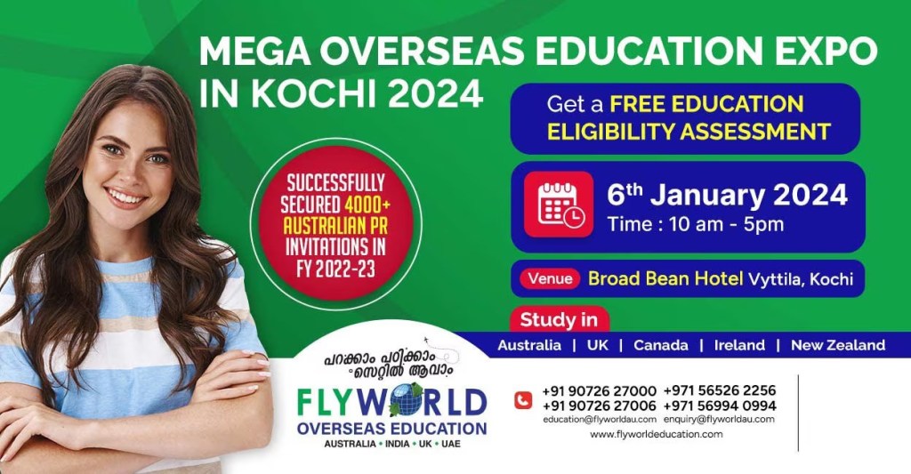 വിദേശത്ത് ഉപരിപഠനം ആഗ്രഹിക്കുന്ന വിദ്യാർത്ഥികൾക്ക് അവരുടെ സംശയങ്ങൾ നേരിട്ട് വിദഗ്ധരിൽ നിന്നും മനസിലാക്കാൻ ഒരു അവസരം ഒരുക്കുകയാണ് ഫ്ലൈവേൾഡ് ഓവർസീസ് എഡ്യൂക്കേഷൻ. ഈ വരുന്ന ജനുവരി 6 ന് കൊച്ചിയിലെ ബ്രോഡ് ബീൻ ഹോട്ടലിൽ വെച്ച് നടത്തുന്ന എക്സ്പോയിൽ ഓസ്ട്രേലിയ, കാനഡ, യുകെ, ന്യൂസീലാൻഡ്, അയർലൻഡ് തുടങ്ങിയ രാജ്യങ്ങളിൽ പഠിക്കാൻ ആഗ്രഹിക്കുന്നവർക്ക് കൃത്യമായ മാർഗ്ഗനിർദ്ദേശങ്ങൾ നൽകുന്നതാണ്. രാവിലെ 10 മണി മുതൽ വൈകിട്ട് 5 മണി വരെ നടക്കുന്ന എക്സ്പോയിൽ ഇപ്പോൾ നിങ്ങൾക്കും രജിസ്റ്റർ ചെയ്യാവുന്നതാണ്. IELTS / PTE തുടങ്ങിയ ഇംഗ്ലീഷ് പ്രൊഫിഷ്യൻസി ടെസ്റ്റുകളെ കുറിച്ചും കൃത്യമായ വിവരങ്ങൾ നിങ്ങൾക്ക് ഇവിടെ നിന്നും ലഭിക്കുന്നതാണ്. ഉന്നത വിദ്യാഭ്യാസത്തിന് ആവശ്യമായ കൃത്യമായ വിവരങ്ങൾ വിദ്യാർത്ഥികൾക്കും മാതാപിതാക്കൾക്കും ലഭ്യമാക്കുന്നതിന് ഏറ്റവും മികച്ച ഒരു സുവർണ്ണാവസരം ആണിത്.