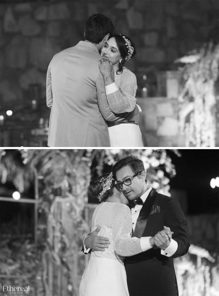 വിവാഹ വേദിയിൽ കറുത്ത സ്യൂട്ട് ധരിച്ചാണ് ആമിർ ഖാൻ എത്തിയത്. വിവാഹ വേദിയിൽ നിന്ന് മകളുടെ വെയിൽ ശരിയാക്കുന്ന താരത്തിന്റെ ചിത്രങ്ങൾ സമൂഹ മാധ്യമങ്ങൾ ഏറ്റെടുത്തു. വിവാഹ വേദിയിലെ വിഡിയോയും വൈറലാണ്. വിഡിയോയിൽ പരസ്പരം ചുംബിക്കുന്ന ഇറയെയും നുപൂറിനെയും കാണാം. ഇരുവരും മോതിരം കൈമാറുമ്പോൾ സന്തോഷത്തോടെ കണ്ണീരൊപ്പുന്ന ആമിർ ഖാന്റെ ദൃശ്യങ്ങൾ ആരാധകരുടെ മനം നിറച്ചു. വിവാഹ വേദിയിലേക്ക് ആമിർ ഖാനും റീന ദത്തയ്ക്കുമൊപ്പമാണ് ഇറ എത്തിയത്.
