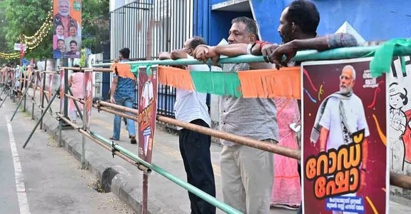 പ്രധാനമന്ത്രി നരേന്ദ്ര മോദിയുടെ റോഡ് ഷോയ്ക്ക് മുന്നോടിയായി ഹോസ്പിറ്റൽ റോഡിന്റെ വശങ്ങളിൽ സ്ഥാപിച്ച ബാരിക്കേഡുകൾ.