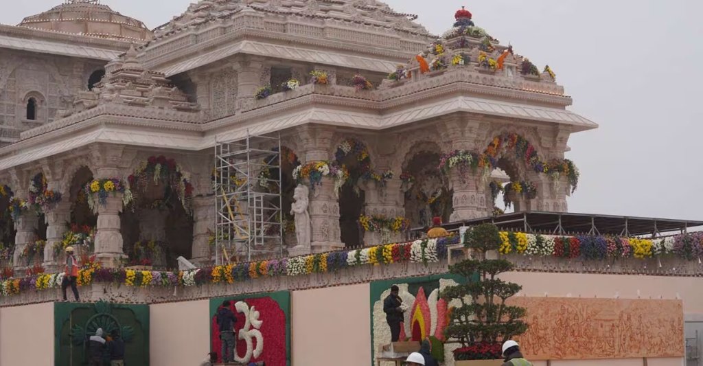 പ്രാണപ്രതിഷ്ഠ ചടങ്ങിനു മുന്നോടിയായ അയോധ്യ രാമക്ഷേത്രം പുഷ്പങ്ങൾ കൊണ്ട് അലങ്കരിക്കുന്ന ജോലി പുരോഗമിക്കുന്നു. (ക്ഷേത്ര ട്രസ്റ്റ് പുറത്തുവിട്ട ചിത്രം)
