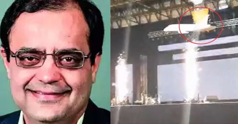 സഞ്ജയ് ഷാ (ഇടത്), സ്റ്റേജിലുണ്ടായ അപകടത്തിന്റെ വിഡിയോ ദൃശ്യത്തിൽ നിന്ന് (വലത്).