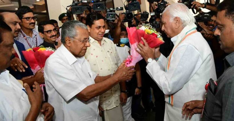 ഗവർണറെ മുഖ്യമന്ത്രി പൂച്ചെണ്ട് നൽകി സ്വീകരിക്കുന്നു. ചിത്രം: പിആർഡി