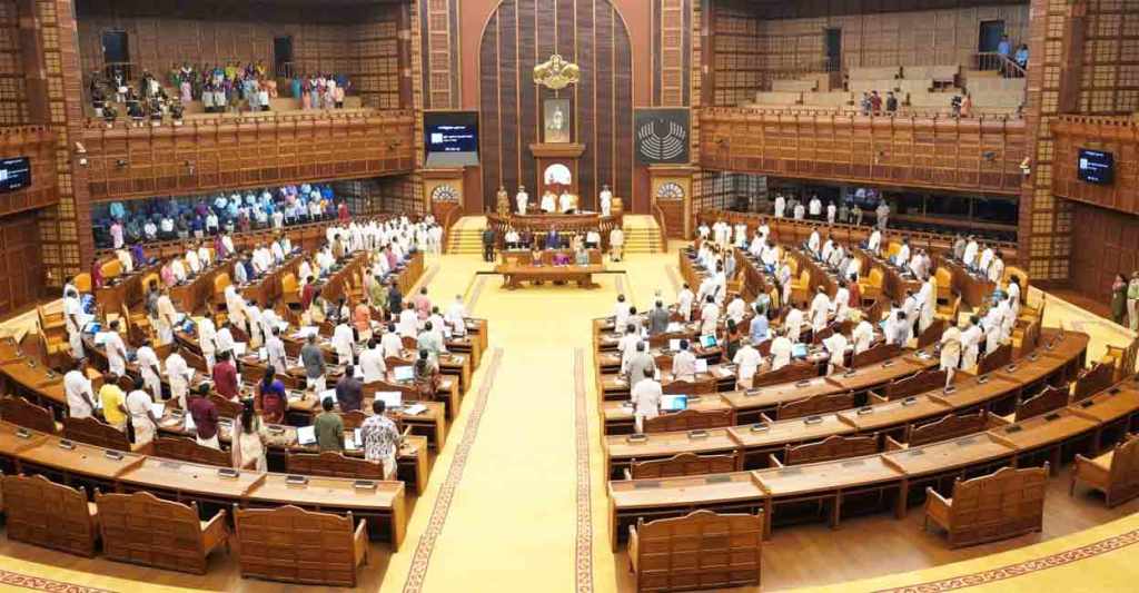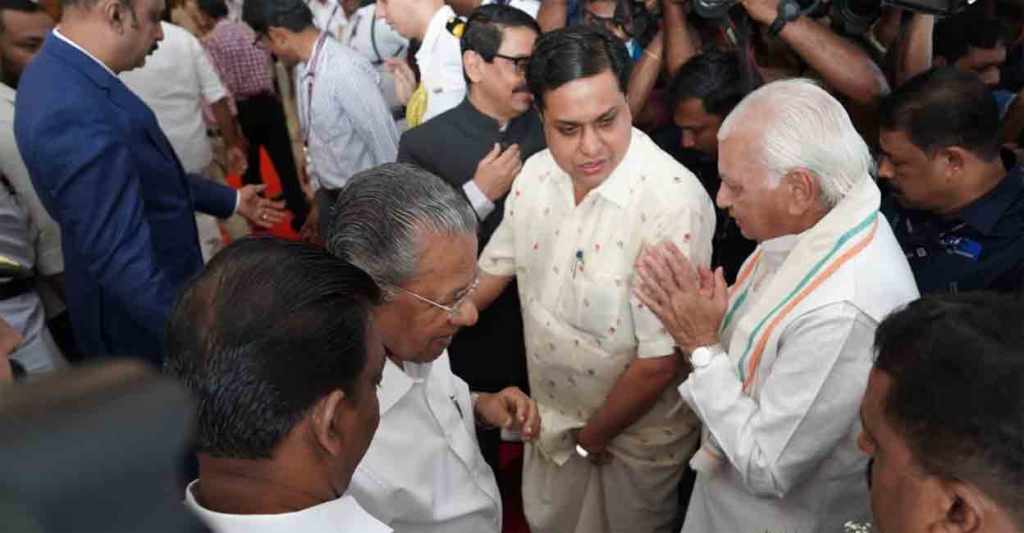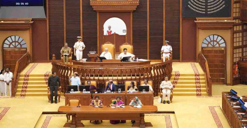 ഗവർണറെ മുഖ്യമന്ത്രിയും സ്പീക്കറും ചേർന്ന് സ്വീകരിക്കുന്നു.