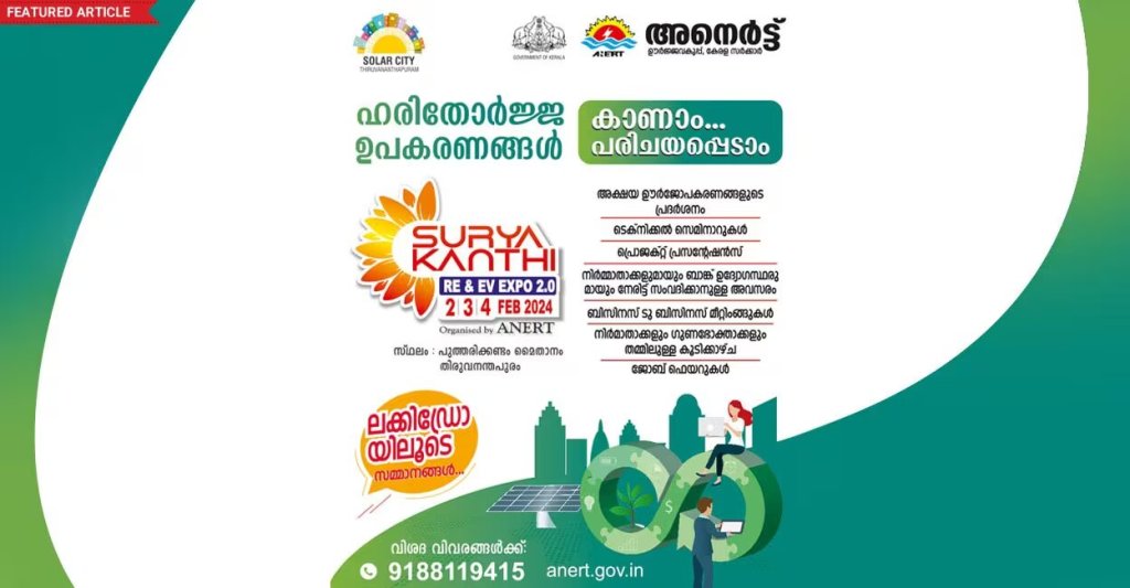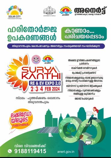 ഹരിതോർജ ഉപഭോഗത്തിന് പ്രധാന്യം നൽകി, ജനങ്ങളെ ബോധവത്കരിക്കുന്നതിനായി അനെർട്ടിന്റെയും തിരുവനന്തപുരം നഗരസഭയുടെയും നേതൃത്വത്തിൽ മെഗാ എക്സ്പോ തിരുവനന്തപുരത്ത് സംഘടിപ്പിക്കാൻ ഒരുങ്ങുകയാണ്. ‘സൂര്യകാന്തി RE & EV എക്സ്പോ 2.0’ എന്ന പേരിൽ സംഘടിപ്പിക്കുന്ന പ്രദർശനം ഫെബ്രു: 2,3,4 തീയതികളിൽ പുത്തരിക്കണ്ടം മൈതാനത്ത് വച്ച് നടക്കും. പൊതുജനങ്ങൾക്ക് ഊർജമേഖലയിലെ പുത്തൻ സാധ്യതകൾ പരിചയപ്പെടാനുള്ള സുവർണാവസരമാണ് എക്സ്പോയിലൂടെ ഒരുക്കുന്നത്.