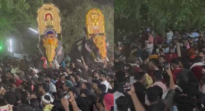 കുന്നംകുളം കാവിലക്കാട് ക്ഷേത്രത്തിൽ എഴുന്നള്ളത്തിനിടെ ആനയെ നിർത്തുന്നതിനെ ചൊല്ലിയുണ്ടായ തർക്കം.(Videograb).
