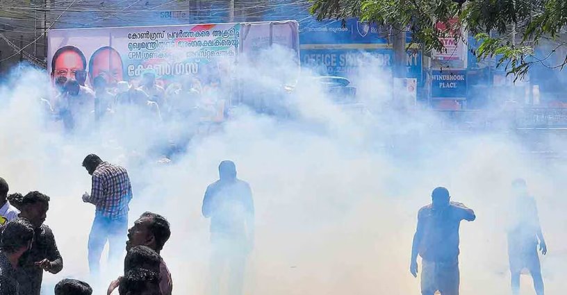 കോൺഗ്രസ് നടത്തിയ ഡിജിപി ഓഫിസ് മാർച്ചിന്റെ വേദിയിലേക്ക് കണ്ണീർവാതക ഷെല്ലും ജലപീരങ്കിയും പ്രയോഗിച്ചപ്പോൾ.