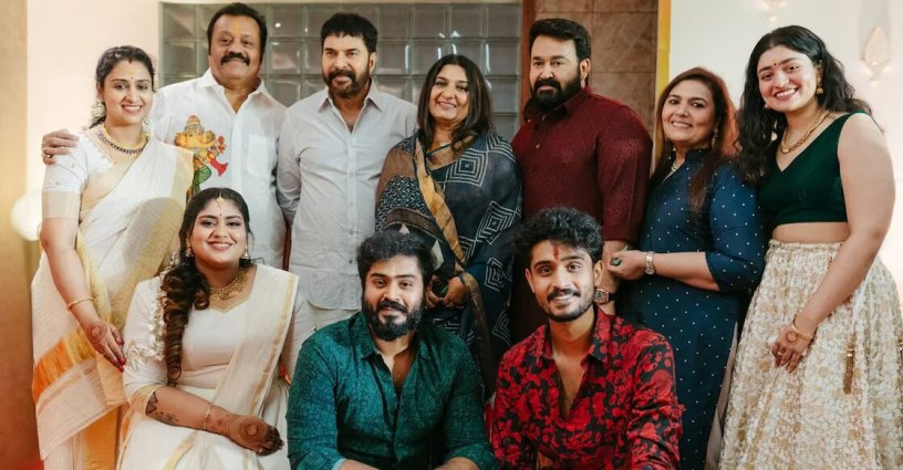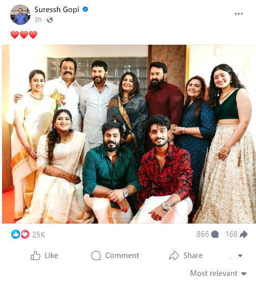മമ്മൂട്ടിക്കും മോഹൻലാലിനുമൊപ്പം കുടുംബസമേതമുള്ള ചിത്രം പങ്കുവച്ച് സുരേഷ് ഗോപി. മകള് ഭാഗ്യ സുരേഷിന്റ വിവാഹത്തലേന്ന് പകർത്തിയ ചിത്രമാണ് സമൂഹ മാധ്യമങ്ങളിലൂടെ താരം പങ്കുവച്ചത്. സുരേഷ് ഗോപി, ഭാര്യ രാധിക, മക്കളായ ഗോകുൽ, മാധവ്, ഭാഗ്യ, ഭാവ്നി എന്നിവർക്കൊപ്പം മമ്മൂട്ടിയും ഭാര്യ സുൽഫത്തും മോഹൻലാലും ഭാര്യ സുചിത്രയും ചിത്രത്തിലുണ്ട്. മൂന്ന് ലവ് ഇമോജികളാണ് ചിത്രത്തിന് അടിക്കുറിപ്പായി സുരേഷ് ഗോപി ചേർത്തത്.