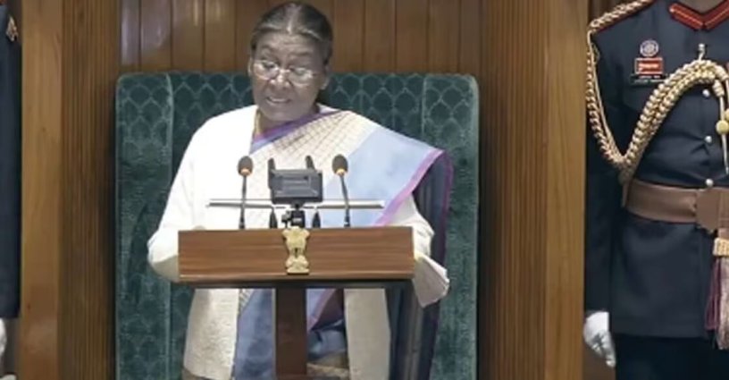 രാഷ്ട്രപതി ദ്രൗപതി മുർമു ഇരുസഭകളുടെയും സംയുക്ത സമ്മേളനത്തെ അഭിസംബോധന ചെയ്യുന്നു. ചിത്രം: X/ANI