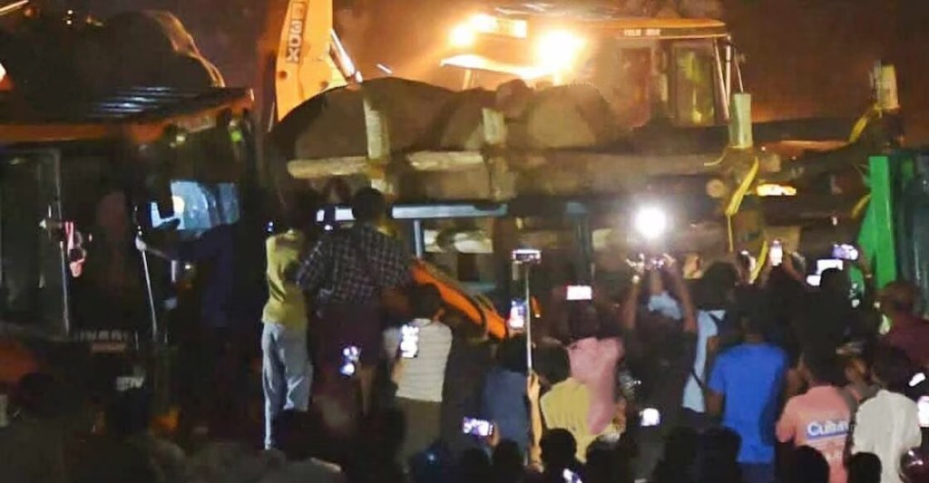 മയക്കുവെടി വച്ച് പിടികൂടിയ തണ്ണീർകൊമ്പനെ വെള്ളിയാഴ്ച രാത്രി എലിഫന്റ് ആംബുലൻസിലേക്ക് മാറ്റിയപ്പോൾ.