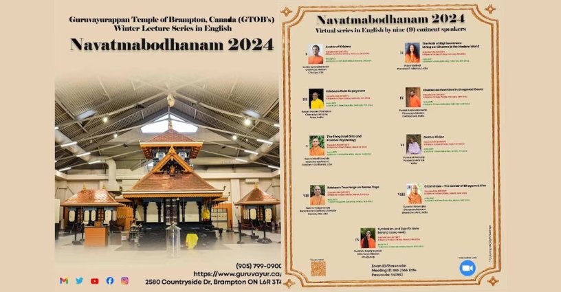 ബ്രാംപ്ടൺ ∙ കാനഡയിലെ പ്രശസ്തമായ ഗുരുവായൂരപ്പൻ ക്ഷേത്രത്തിൽ (ഗുരുവായൂരപ്പൻ ടെംപിൾ ഓഫ് ബ്രാംപ്ടൺ) ഫെബ്രുവരി രണ്ടാം തീയതി മുതൽ എല്ലാ വെള്ളിയാഴ്ചയും ആത്മീയ പ്രഭാഷണത്തിന് തുടക്കമായി. ലോകപ്രശസ്തരായ ഒൻപതു സനാതന ഗുരുക്കളാണ് ഈ നവാത്മബോധനത്തിലൂടെ ക്തജനങ്ങൾക്ക് ധർമ്മ മാർഗത്തിലൂടെ അറിവും മോക്ഷമാർഗവും ഉപദേശിച്ചു ജീവിതോപദേശങ്ങളിലൂടെ വ്യാഖ്യാനിക്കുന്നത്.