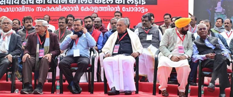 ജന്തർ മന്തറിലെ സമരവേദിയിൽ മുഖ്യമന്ത്രി പിണറായി വിജയനൊപ്പം ഡൽഹി മുഖ്യമന്ത്രി അരവിന്ദ് കേജ്രിവാളും പഞ്ചാബ് മുഖ്യമന്ത്രി ഭഗവന്ത് മാനും. സിപിഎം ജനറൽ സെക്രട്ടറി സീതാറാം യച്ചൂരി, സിപിഐ സംസ്ഥാന സെക്രട്ടറി ബിനോയ് വിശ്വം, സിപിഐ ജനറൽ സെക്രട്ടറി ഡി.രാജ എന്നിവർ സമീപം.