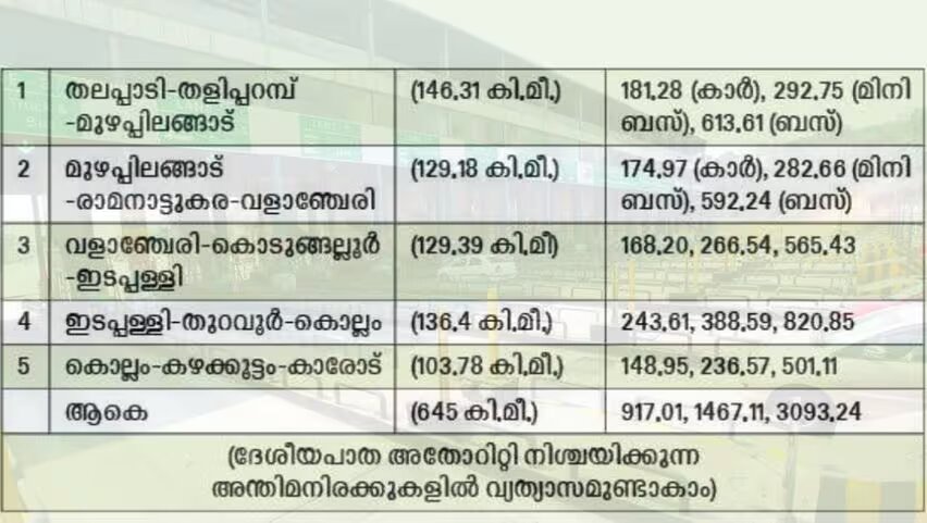 കാസര്കോട് തലപ്പാടിമുതല് തിരുവനന്തപുരം കാരോടുവരെ 645 കിലോമീറ്റര് നീളത്തില് ദേശീയപാത 66-ന്റെ നിര്മാണം പൂര്ത്തിയാകുന്നതോടൊപ്പം 11 ഇടത്ത് പുതിയ ടോള് കേന്ദ്രങ്ങളും വരുന്നു. തിരുവനന്തപുരം, കൊല്ലം ജില്ലകളില് രണ്ടുവീതവും ആലപ്പുഴ, എറണാകുളം, തൃശ്ശൂര്, മലപ്പുറം, കോഴിക്കോട്, കണ്ണൂര്, കാസര്കോട് ജില്ലകളില് ഒരോ കേന്ദ്രങ്ങളുമാണ് ഉണ്ടാവുക.
