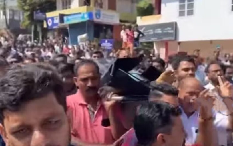 കാട്ടാനയാക്രമണത്തിൽ കൊല്ലപ്പെട്ടയാളുടെ മൃതദേഹവുമായി പ്രതിഷേധിക്കുന്ന നാട്ടുകാർ.