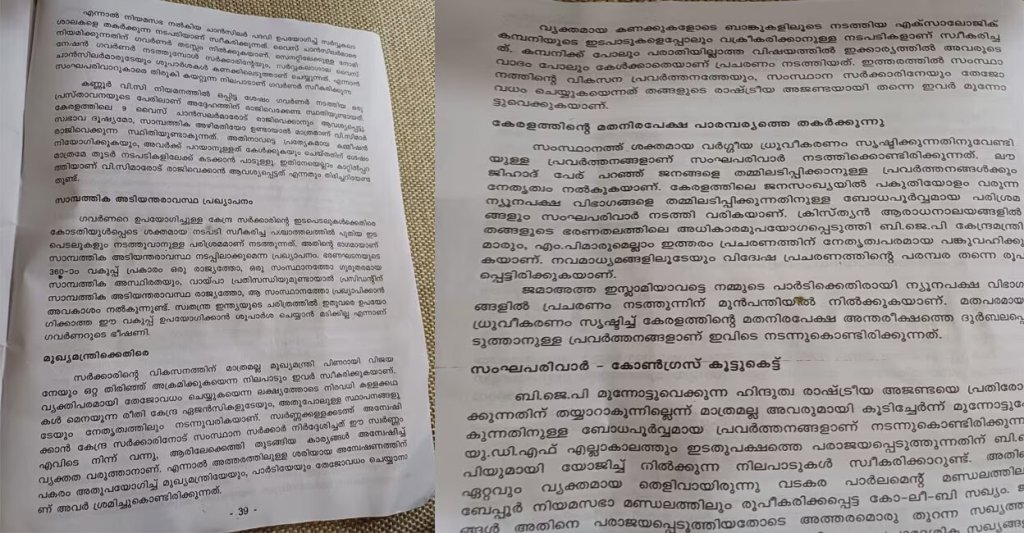 കേന്ദ്രസർക്കാരിന്റെ കേരളത്തിനെതിരെയുള്ള പ്രവർത്തനങ്ങൾ വിശദീകരിക്കുന്ന ഭാഗത്താണ് എക്സാലോജിക്കിനെക്കുറിച്ചും പറയുന്നത്. രേഖയിൽ പറയുന്നതിങ്ങനെ: ‘വ്യക്തമായ കണക്കുകളോടെ ബാങ്കുകളിലൂടെ നടത്തിയ എക്സാലോജിക് കമ്പനിയുടെ ഇടപാടുകളെപോലും വക്രീകരിക്കാനുള്ള നടപടികളാണ് സ്വീകരിച്ചത്. കമ്പനിക്ക് പോലും പരാതിയില്ലാത്ത വിഷയത്തിൽ ഇക്കാര്യത്തിൽ അവരുടെ വാദംപോലും കേൾക്കാതെയാണ് പ്രചാരണം നടത്തിയത്. സംസ്ഥാനത്തിന്റെ വികസന പ്രവർത്തനത്തെയും, സംസ്ഥാന സർക്കാരിനെയും തേജോവധം ചെയ്യുകയെന്നതു തങ്ങളുടെ രാഷ്ട്രീയ അജണ്ടയായി തന്നെ അവർ മുന്നോട്ടുവയ്ക്കുകയാണ്’–രേഖയിൽ പറയുന്നു.