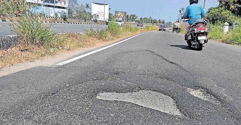 പോട്ടയിൽ ദേശീയപാത സർവീസ് റോഡിൽ ടാറിങ് മുഴച്ചു പൊന്തുകയും ഇളകി മാറുകയും ചെയ്ത ഭാഗം.