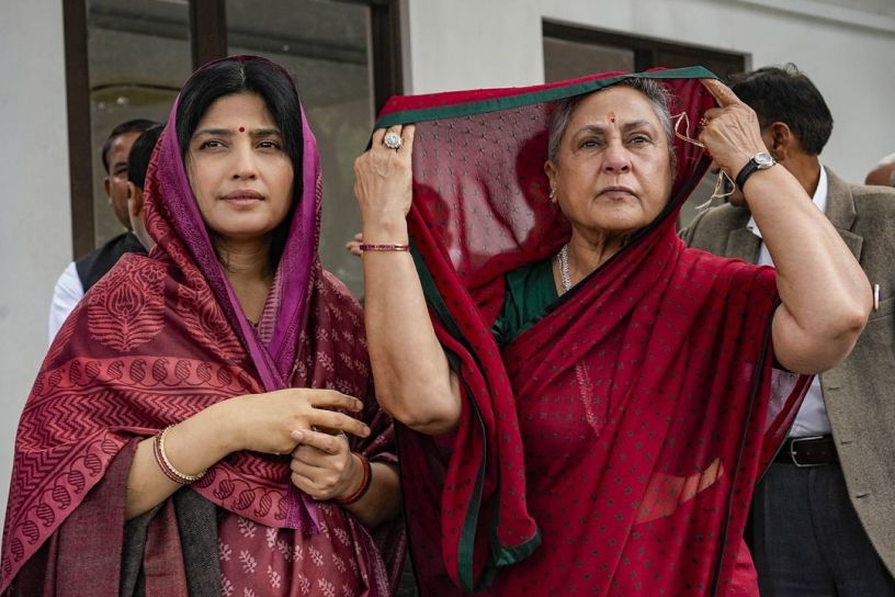 സമാജ്വാദി പാർട്ടി എം.പി. ഡിംപിൾ യാദവും ജയാ ബച്ചനും സാളിഗ്രാം ശിലാ പ്രാർത്ഥനയ്ക്കായി ലഖ്നൗവിലെ പാർട്ടി ആസ്ഥാനത്ത് എത്തിയപ്പോൾ Photo: PTI