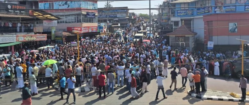 കാട്ടാനയുടെ ആക്രമണത്തിൽ കൊല്ലപ്പെട്ട പോളിന്റെ മൃതദേഹം പുൽപ്പള്ളിയിൽ എത്തിച്ചതിനു പിന്നാലെ നടക്കുന്ന പ്രതിഷേധം.