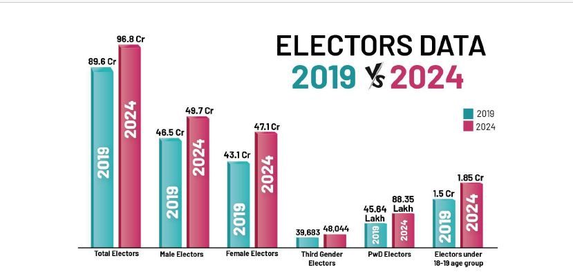 കമ്മിഷന്റെ കണക്കുപ്രകാരം ഇത്തവണ 96.88 കോടി(96,88,21,926) വോട്ടര്മാരുണ്ട്. സ്വാഭാവികമായും ഇതുവരെയുള്ള റെക്കോര്ഡ് എണ്ണമാണിത്. വോട്ടര്മാരുടെ എണ്ണം കഴിഞ്ഞ പൊതുതിരഞ്ഞെടുപ്പു കാലത്തേക്കാള് 6 ശതമാനം കൂടിയിട്ടുണ്ട്. ഇത്തവണ, ഇതുവരെ ആകെ രജിസ്റ്റര് ചെയ്ത വോട്ടര്മാരില് 49,72,31,994 പുരുഷന്മാരും 47,15,41,888 സ്ത്രീകളുമാണ്. 2019-ല് 89.6 കോടിയായിരുന്നു 2019 ലെ ആകെ വോട്ടര്മാരുടെ എണ്ണം. അഞ്ച് കൊല്ലം കഴിഞ്ഞപ്പോള് വര്ധനവ് 7.2 കോടി. പുരുഷന്മാരുടെ എണ്ണം 2019-ല് 46.5 കോടിയായിരുന്നത് ഇപ്പോള് 49.7 കോടിയായി. വനിതകളുടെ എണ്ണം 43.1 കോടിയായിരുന്നത് 47.1 കോടിയായി.