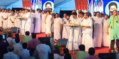 സമാപനത്തിലും ‘സമരാഗ്നി’യിൽ അമളി; ദേശീയഗാനം തെറ്റിച്ചുപാടി പാലോട് രവി, സി.ഡി ഇടാമെന്ന് സിദ്ദിഖ്
