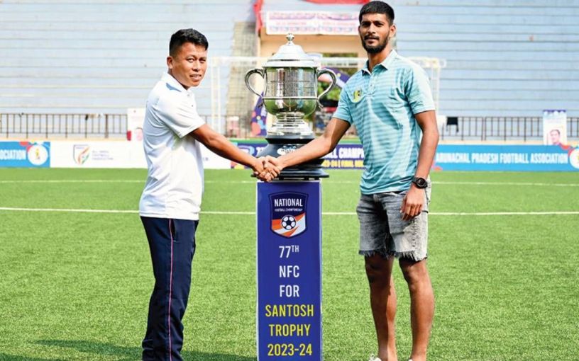 സന്തോഷ് ട്രോഫി ഫുട്ബോൾ ഫൈനലിൽ ഏറ്റുമുട്ടുന്ന സർവീസസ് ക്യാപ്റ്റൻ ക്രിസ്റ്റഫർ കമേയും ഗോവയുടെ ക്യാപ്റ്റൻ മുഹമ്മദ് അലിയും വെള്ളിയാഴ്ച കിരീടത്തിനൊപ്പം ഫോട്ടോയ്ക്ക് പോസ് ചെയ്തപ്പോൾ