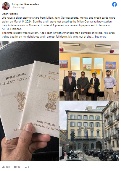 ഫ്ളോറന്സില് നടക്കുന്ന അഡ്വാന്സ്ഡ് ടെക്നോളജീസ് ആന്ഡ് ട്രീറ്റ്മെന്റ് ഫോര് ഡയബറ്റീസ് (ADDA) സമ്മേളനത്തില് പങ്കെടുക്കാനായി മിലന് സെന്ട്രല് റെയില്വേ സ്റ്റേഷനിലേക്ക് പ്രവേശിക്കുമ്പോഴാണ് തന്റെയും ഭാര്യ സുനിതയുടേയും പാസ്പോര്ട്ടും പണവും ക്രഡിറ്റ് കാര്ഡും മോഷ്ട്ടിക്കപ്പെട്ട കാര്യം മനസ്സിലാവുന്നത്.