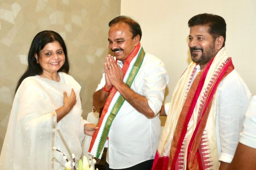 മുഖ്യമന്ത്രി രേവന്ത് റെഡ്ഡിയും തെലങ്കാനയുടെ ചുമതലയുള്ള എ.ഐ.സി.സി. ജനറൽ സെക്രട്ടറി ദീപാദാസ് മുൻഷിയും രഞ്ജിത്ത് റെഡ്ഡിയെ കോൺഗ്രസിലേക്ക് സ്വീകരിക്കുന്നു | Photo: X (twitter) @INCTelangana