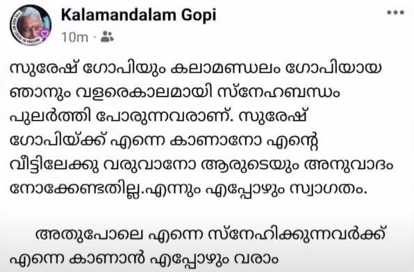 തൃശ്ശൂര്: തൃശ്ശൂരിലെ ബി.ജെ.പി. സ്ഥാനാര്ഥി സുരേഷ് ഗോപിയെ വീട്ടിലേക്ക് ക്ഷണിച്ച് കലാണ്ഡലം ഗോപി. സുരേഷ് ഗോപിയും താനും വളരെക്കാലമായി സ്നേഹബന്ധം പുലര്ത്തിപ്പോരുന്നവരാണെന്ന് അദ്ദേഹം ഫെയ്സ്ബുക്കില് കുറിച്ചു. സുരേഷ് ഗോപിക്ക് തന്നെ കാണാനോ വീട്ടിലേക്ക് വരാനോ ആരുടേയും അനുവാദം നോക്കേണ്ടതില്ല. എന്നും എപ്പോഴും സ്വാഗതം. അതുപോലെതന്നെ സ്നേഹിക്കുന്നവര്ക്ക് തന്നെ കാണാന് എപ്പോഴും വരാമെന്നും അദ്ദേഹം കൂട്ടിച്ചേര്ത്തു.