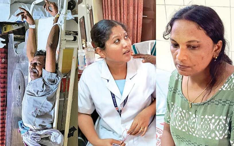 അക്രമി മാധവൻ നായരെ തൃപ്പൂണിത്തുറ താലൂക്കാശുപത്രിയിൽ സ്ട്രെച്ചറിൽ കെട്ടിയിട്ടപ്പോൾ, തൃപ്പൂണിത്തുറ അക്രമത്തിൽ പരിക്കേറ്റ നഴ്സ് ദിവ്യ, മർദനമേറ്റ പോലീസുദ്യോഗസ്ഥ റെജി തൃപ്പൂണിത്തുറ താലൂക്കാശുപത്രിയിൽ.