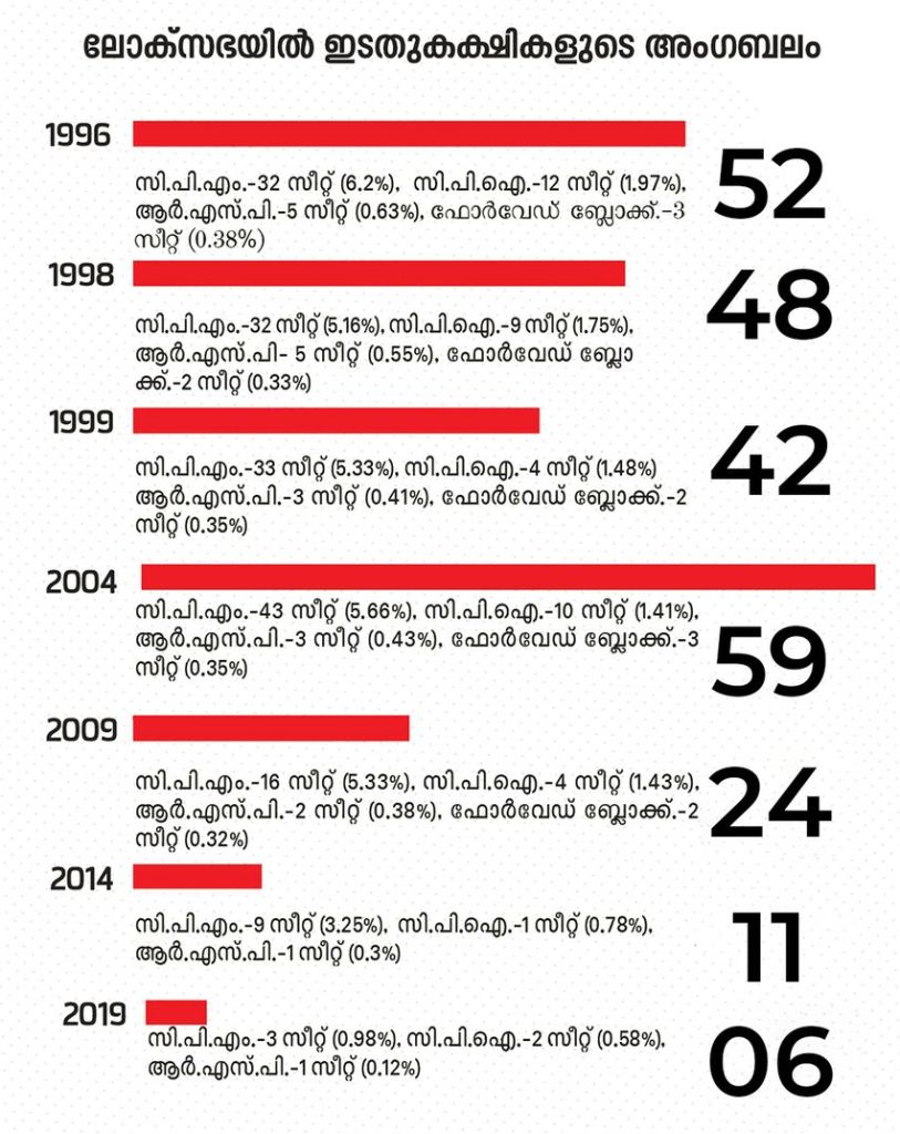 പശ്ചിമബംഗാളിൽ 2019-ലെ തിരഞ്ഞെടുപ്പിൽ സി.പി.എമ്മിന് സീറ്റുണ്ടായില്ല. ഇടതുപക്ഷം അധികാരത്തിലിരിക്കുന്ന കേരളത്തിൽ 2019-ൽ കിട്ടിയത് ഒരുസീറ്റ്. 2019-ൽ ആകെ 71 സീറ്റുകളിൽ രാജ്യത്ത് മത്സരിച്ചതിൽ സി.പി.എമ്മിനു നേടാനായത് തമിഴ്നാട്ടിൽനിന്ന് രണ്ടും കേരളത്തിൽനിന്ന് ഒന്നുമടക്കം മൂന്ന് സീറ്റുമാത്രം.