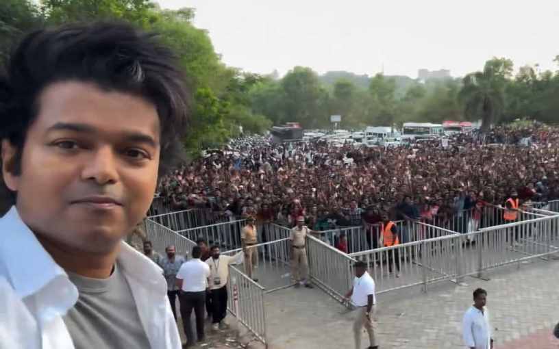 തിരുവനന്തപുരത്ത് ആരാധകർക്കൊപ്പം സെൽഫിയെടുക്കുന്ന വിജയ് | ഫോട്ടോ: സ്ക്രീൻഗ്രാബ്