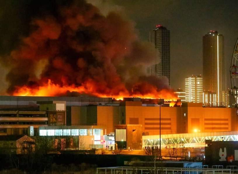 വെടിവെയ്പ് നടന്ന ക്രോക്കസ് ഹാളിൽ നിന്ന് തീ ഉയരുന്നു| ഫോട്ടോ:എ.എഫ്.പി.