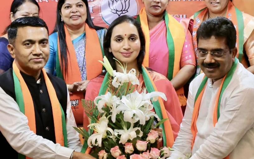 ഗോവ മുഖ്യമന്ത്രി പ്രമോദ് സാവന്തും ബി.ജെ.പി. സംസ്ഥാന അധ്യക്ഷൻ സദാനന്ദ തനാവ്ഡെയും പല്ലവി ഡെംപോയെ അനുമോദിക്കുന്നു | Photo: Facebook/ Dr. Pramod Sawant