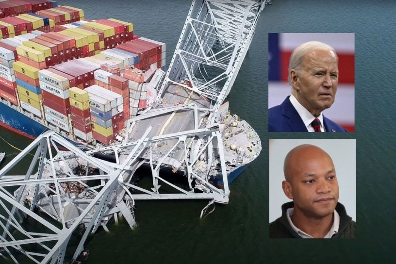യു.എസ്സിലെ ബാൾട്ടിമോറിൽ പാലത്തിലിച്ച കപ്പൽ. ഇൻസൈറ്റിൽ യു.എസ്. പ്രസിഡന്റ് ജോ ബൈഡനും മെറിലാൻഡ് ഗവർണർ വെസ് മൂറും | Photo: AFP, AP, facebook.com/iamwesmoore