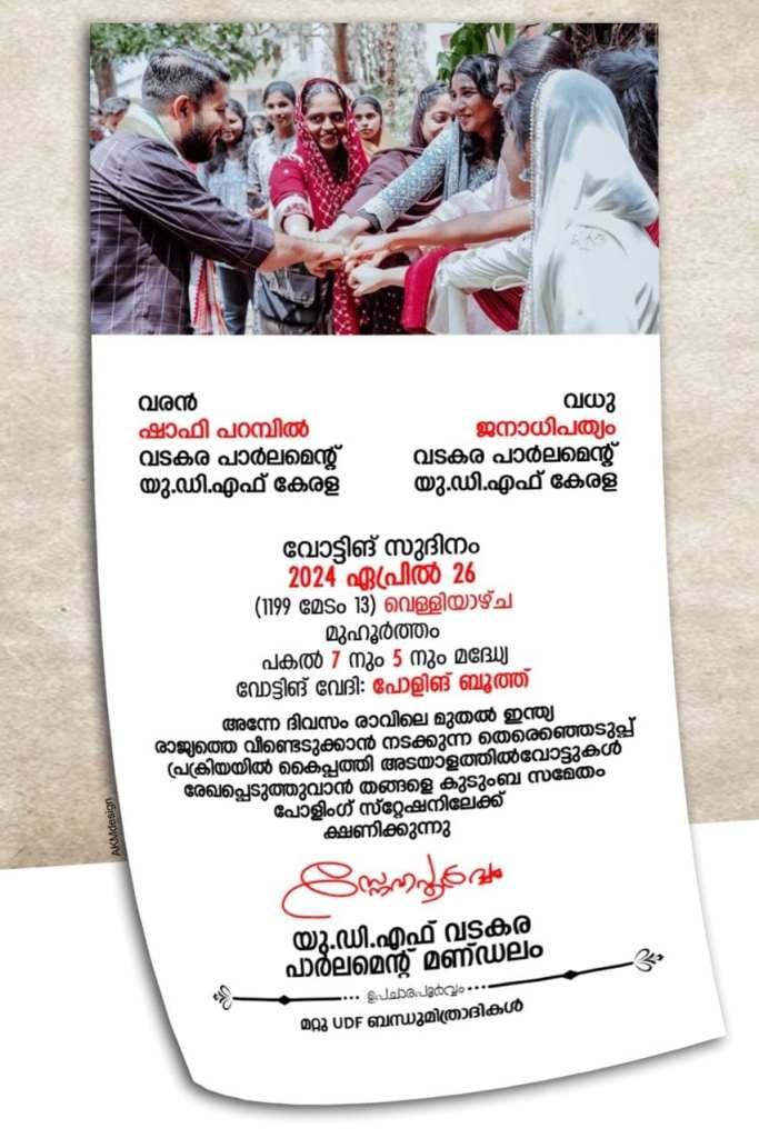 ‘വിവാഹ’ത്തിലെ വരന് ഷാഫി പറമ്പിലാണ്. വധു ജനാധിപത്യവും. വോട്ടിങ് സുദിനം 2024 ഏപ്രില് 26 ആണെന്നും മുഹൂര്ത്തം പകല് ഏഴിനും അഞ്ചിനും ഇടയിലാണെന്നും കത്തില് വ്യക്തമായി രേഖപ്പെടുത്തിയിട്ടുണ്ട്. വോട്ടിങ് വേദി പോളിങ് സ്റ്റേഷനാണ്! ഇത്തരത്തില് രസകരമായാണ് കത്തിന്റെ ആദ്യഭാഗമെങ്കില് ഇതിന് ശേഷമുള്ള കാര്യങ്ങള് രാജ്യം കടന്നുപോകുന്ന ഗുരുതരമായ സാഹചര്യത്തിലേക്കുള്ള സൂചന കൂടി നല്കുന്നുണ്ട്.