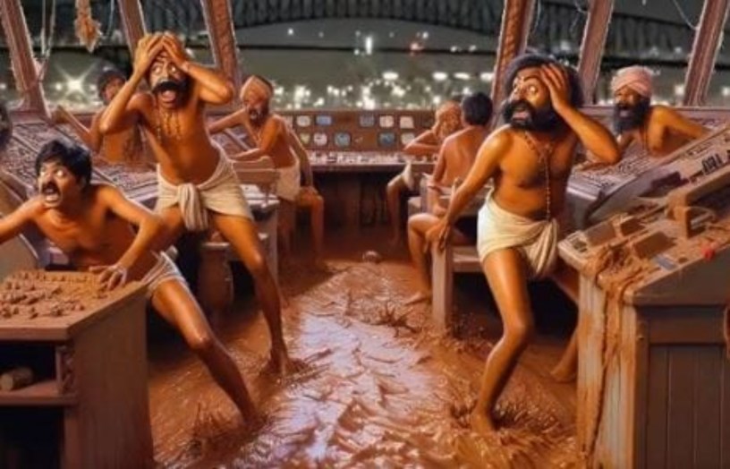 കപ്പല് പാലത്തില് ഇടിക്കുന്നതിന് തൊട്ടുമുന്പുള്ള ദൃശ്യങ്ങള് എന്ന അടിക്കുറിപ്പോടെയാണ് കാര്ട്ടൂണ് പ്രസിദ്ധീകരിച്ചിട്ടുള്ളത്. അര്ധനഗ്നരായി, ലങ്കോട്ടി മാത്രം ധരിച്ച കുറച്ച് ജീവനക്കാര് കപ്പലിന്റെ കണ്ട്രോള് റൂമില് ഭയന്നുവിറച്ചുനില്ക്കുന്നതാണ് ചിത്രീകരിച്ചിട്ടുള്ളത്. ജീവനക്കാര് നില്ക്കുന്നത് ചെളിവെള്ളത്തിലാണ്. കപ്പല് പാലത്തിന് നേര്ക്ക് നീങ്ങുമ്പോള് ഇവര് പരസ്പരം അസഭ്യം പറയുന്നതും കാര്ട്ടൂണിലുണ്ട്. ജീവനക്കാരില് ചിലര്ക്ക് തലപ്പാവുമുണ്ട്.