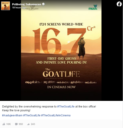 പൃഥ്വിരാജാണ് ഒരു പോസ്റ്ററിലൂടെ ആടുജീവിതം സിനിമയുടെ ഓപ്പണിങ് ഡേ കളക്ഷനേക്കുറിച്ച് അറിയിച്ചത്. ലോകമെമ്പാടുമുള്ള 1724 സ്ക്രീനുകളിൽനിന്നാണ് ചിത്രം ഈ നേട്ടം കൈവരിച്ചത്. പൃഥ്വിരാജിന്റെ കരിയറിലെ ഏറ്റവും ഉയർന്ന ആദ്യദിന കളക്ഷനും ആടുജീവിതത്തിനാണ്. മികച്ച പ്രതികരണമായിരുന്നു ബുക്കിങ് ആരംഭിച്ചപ്പോൾ മുതൽ ചിത്രത്തിന് ലഭിച്ചത്. ആദ്യ ദിവസത്തെ ആഗോള കളക്ഷൻ പത്തുകോടിക്ക് മുകളിലുണ്ടാവുമെന്ന് ട്രേഡ് അനലിസ്റ്റുകൾ വിലയിരുത്തിയിരുന്നു.