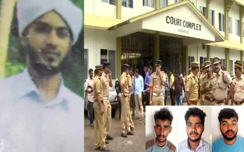 കൊല്ലപ്പെട്ട റിയാസ് മൗലവി(ഇടത്ത്) കാസർകോട് സെഷൻസ് കോടതിക്ക് മുൻപിലെ ദൃശ്യം. ഇൻസെറ്റിൽ പ്രതികളായ നിതിൻകുമാർ, അജേഷ്, അഖിലേഷ്.