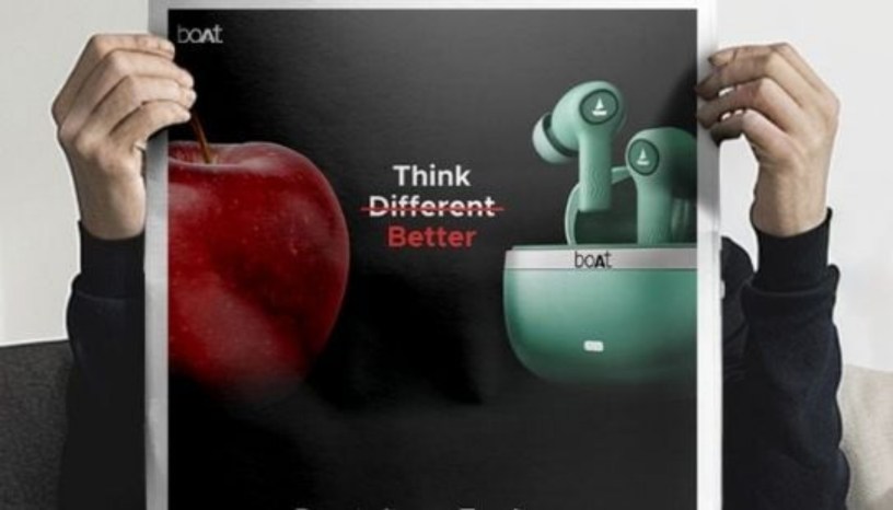 മാറി ചിന്തിക്കുകയല്ല, മെച്ചപ്പെട്ട രീതിയില് ചിന്തിക്കുകയാണ് വേണ്ടതെന്ന് പരസ്യവാചകം പറയുന്നു. ഒരു ആപ്പിളിന്റെ ചിത്രത്തിനൊപ്പം ബോട്ടിന്റെ വയര്ലെസ് ഇയര്ഫോണുകളുടെ ചിത്രവും നല്കിയിരിക്കുന്നു.