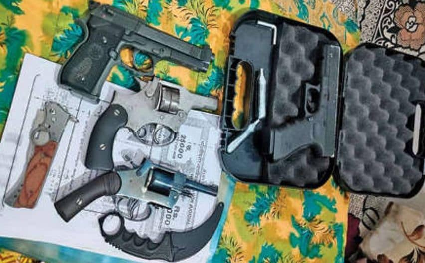 പോലീസ് പിടിച്ചെടുത്ത തോക്കുകളും കത്തിയും