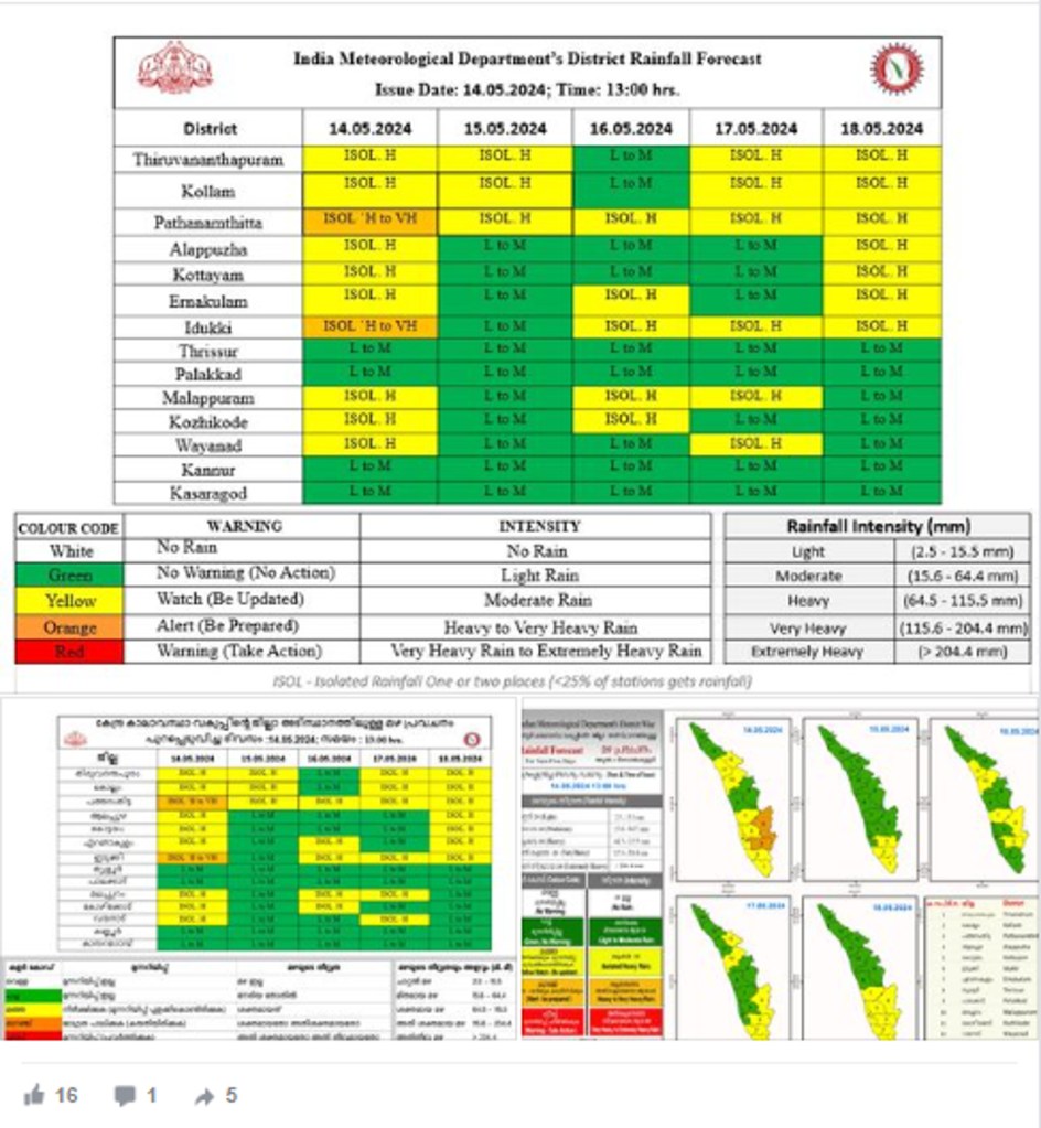 16-ാം തീയതി പത്തനംതിട്ട, ഇടുക്കി, എറണാകുളം, മലപ്പുറം, കോഴിക്കോട് ജില്ലകളിലും 17-ന് തിരുവനന്തപുരം, കൊല്ലം, പത്തനംതിട്ട, ഇടുക്കി, മലപ്പുറം, വയനാട് ജില്ലകളിലും 18-ന് തിരുവനന്തപുരം, കൊല്ലം, പത്തനംതിട്ട, ആലപ്പുഴ, കോട്ടയം, ഇടുക്കി, എറണാകുളം ജില്ലകളിലും യെല്ലോ അലര്ട്ടാണ് പ്രഖ്യാപിച്ചിട്ടുള്ളത്.