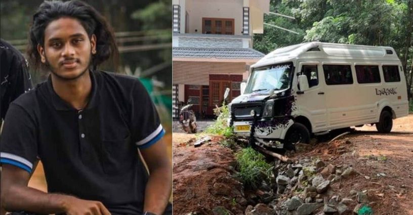 മരിച്ച നന്ദു, അപകടത്തിൽപെട്ട ട്രാവലർ| Photo: Special Arragement