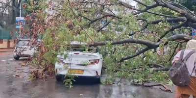 തൃശ്ശൂർ സ്വരാജ് റൗണ്ടിൽ കാറിന് മുകളിലേക്ക് മരം കടപുഴകിവീണു