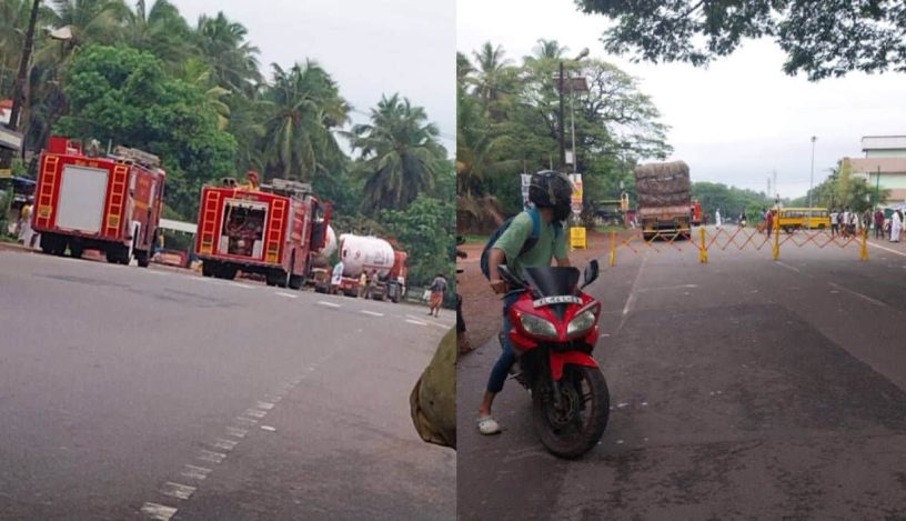 വാകതച്ചോർച്ചയുണ്ടായ വാഹനം നിർത്തിയിട്ടിരിക്കുന്നു, അഗ്നിരക്ഷാസേനാവാഹനങ്ങൾ സമീപം, ഗതാഗതം നിയന്ത്രിച്ചിരിക്കുന്നു.