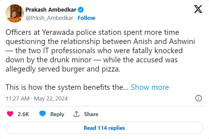 അതേസമയം, മരിച്ച യുവതിയും യുവാവും തമ്മിലുള്ള ബന്ധം അന്വേഷിക്കാനാണ് പോലീസ് ഏറെസമയം ചിലവഴിച്ചതെന്ന് മഹാരാഷ്ട്രയില് വഞ്ചിത് ബഹുജന് അഘാഡി (വി.ബി.എ.) നേതാവ് പ്രകാശ് അംബേദ്കർ ആരോപിച്ചു. ആരോപണവിധേയനായ പ്രതിക്ക് പോലീസ് ബർഗറും പിസ്സയും നൽകിയതായും അദ്ദേഹം ചൂണ്ടിക്കാട്ടി.