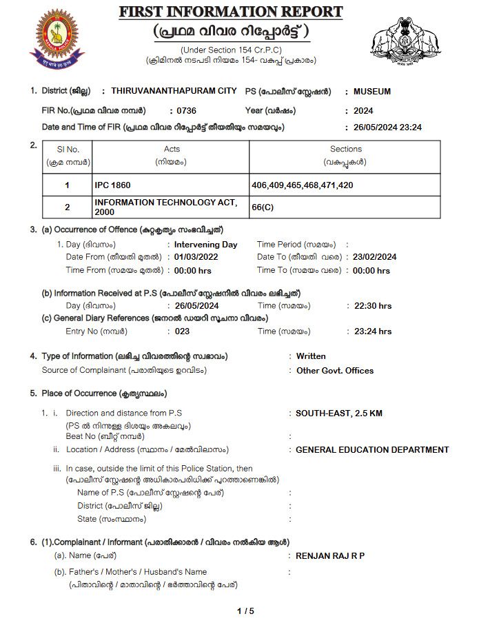പൊതുവിദ്യാഭ്യാസ വകുപ്പിലെ സീനിയര് അഡ്മിനിസ്ട്രേറ്റീവ് ഓഫീസര് പോലീസിന് നല്കിയ പരാതിയിന്മേലുള്ള എഫ്.ഐ.ആറിന്റെ പകര്പ്പ്