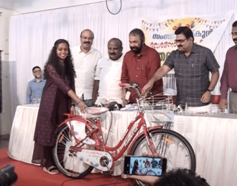 അവന്തികയ്ക്ക് വിദ്യാഭ്യാസമന്ത്രി സൈക്കിൾ കൈമാറുന്നു
