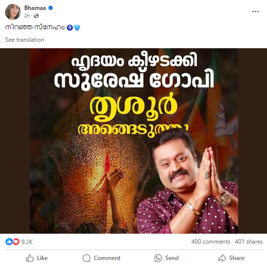 ലോക്സഭ തെരഞ്ഞെടുപ്പില് തൃശൂരില് വിജയമുറപ്പിച്ച എന്ഡിഎ സ്ഥാനാര്ത്ഥി സുരേഷ് ഗോപിക്ക് ആശംസകളുമായി മലയാള സിനിമാ ലോകം. ജ്യോതികൃഷ്ണ, ഭാമ, സുധീർ തുടങ്ങി നിരവധി താരങ്ങളാണ് സമൂഹ മാധ്യമങ്ങളിലൂടെ സുരേഷ് ഗോപിക്ക് ആശംസകളുമായി എത്തുന്നത്.