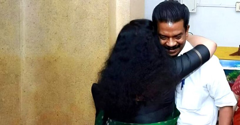 മുൻ മന്ത്രി കെ.രാധാകൃഷ്ണനെ ആശ്ലേഷിക്കുന്ന ദിവ്യ എസ്. അയ്യർ