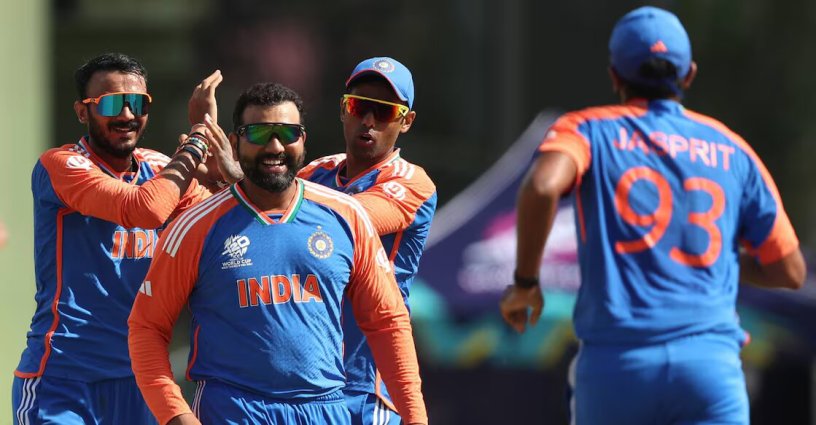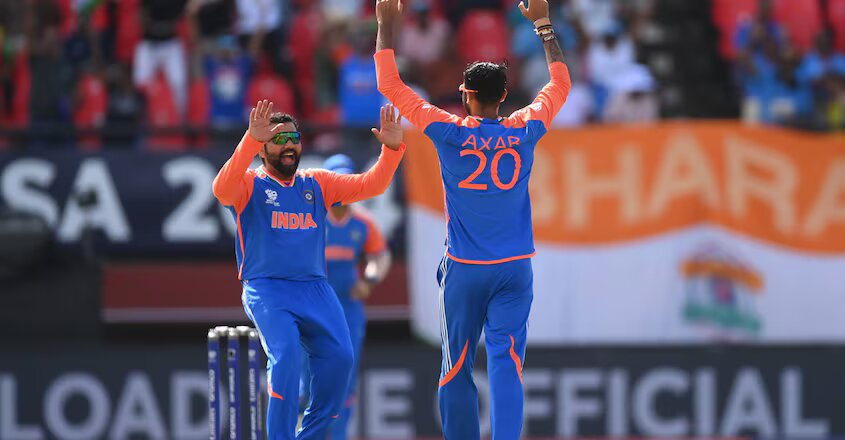 രോഹിത് ശർമയും അക്ഷര് പട്ടേലും വിക്കറ്റ് നേട്ടം ആഘോഷിക്കുന്നു. Photo: X@BCCI