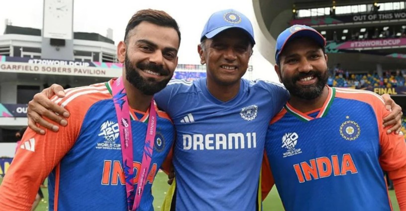 വിരാട് കോലിയും രോഹിത് ശർമയും ഇന്ത്യൻ പരിശീലകന് രാഹുല് ദ്രാവിഡിനൊപ്പം. Photo: X@Johns